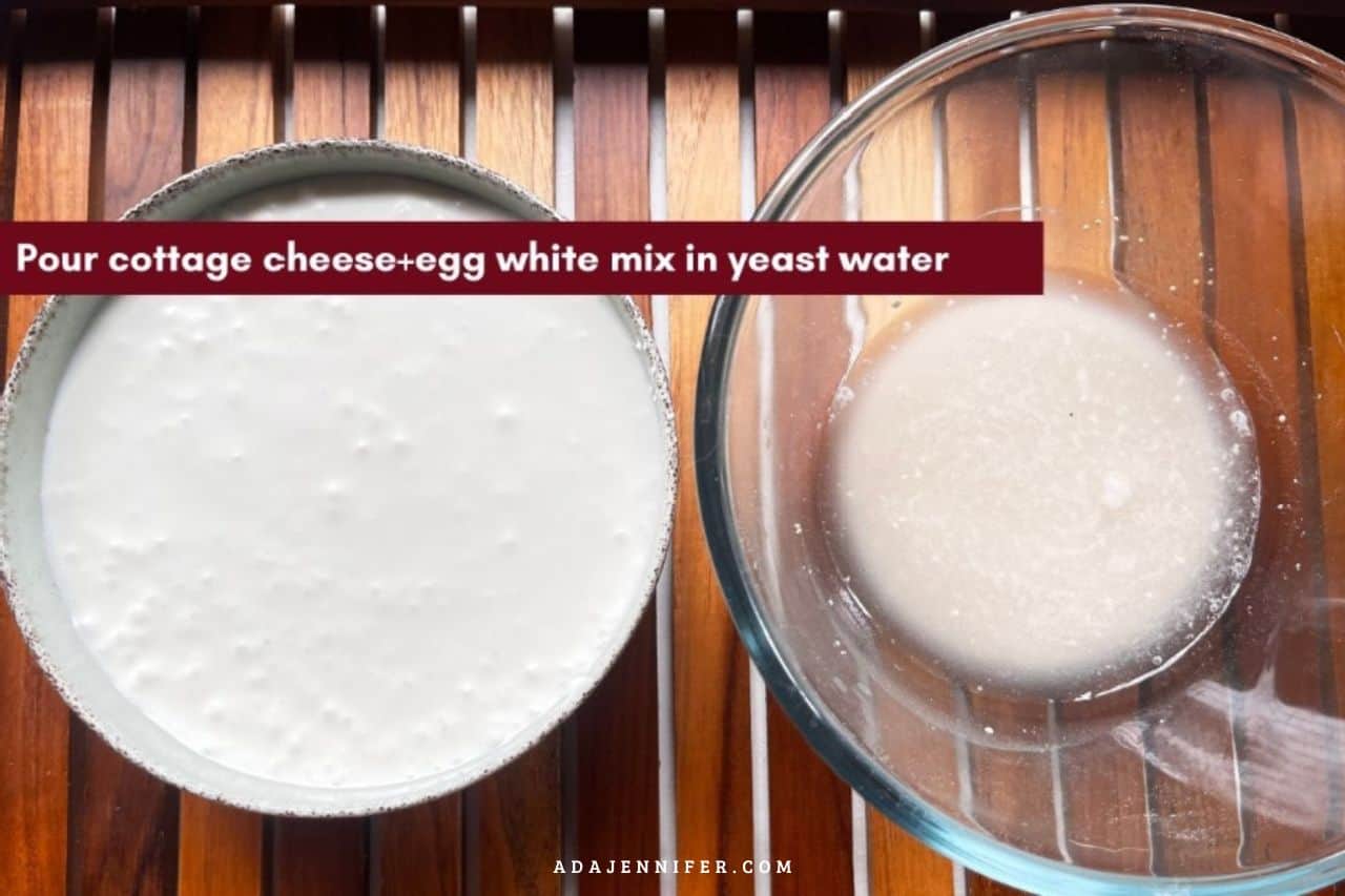 3. Transfer the cottage cheese+egg white batter into the yeast bowl and mix well.