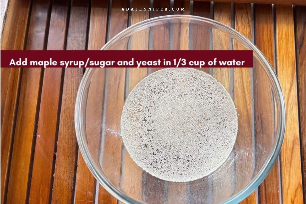 1. In a big bowl, take ⅓ cup of warm water and 7 gms of maple syrup (or any kind of sugar). Mix it well, and then add 7 gms of dry yeast (active). Let the yeast activate for a few minutes. You know your yeast is activated once the bubbles start to form.